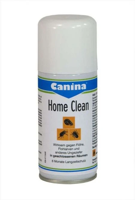 Wirksam gegen Flöhe, Flohlarven und anderes Ungeziefer Caninas Home Clean – der schnelle Tod für Läuse, Flöhe, deren Larven und Eigelege sowie anderes Ungeziefer in geschlossenen Räumen. Das in Caninas Home Clean enthaltene Permethrin tötet schnell und zuverlässig Flöhe und Flohlarven. Wirkungsweise: Der Langzeitschutz beruht auf der Wirkstoffkombination des Produktes , der bis zu 24 Wochen den Entwicklungszyklus der Flöhe bzw. des Ungeziefers verhindert. Inhalt: 150ml , Zusammensetzung: 1000ml enthalten: Permetrin 6,809g, Piperonylbutoxid 15,184g, Ethylalkohol 450g, Pyriproxifen 0,456g , Anwendung: Home Clean wird im Aufenthaltsraum der Tiere zentral auf einen erhöhten Platz gestellt, z.B. auf einen mit Zeitungspapier abgedeckten Tisch. Zuerst den weißen Kunststoffdeckel entfernen, dann die weiße Kunststofflasche hinunterdrücken, bis sie einrastet. Danach sollte die Tür des Raumes von außen geschlossen und für 2 Stunden nicht betreten werden. Der Inhalt von Home Clean entleert sich binnen weniger Minuten und reicht aus für ca. 60 qm bzw. 150 cbm. Anschließend eine halbe Stunde gründlich lüften. , Vorbereitung der zu behandelnden Räume: – Möglichst alle Räume behandeln zu denen Hund/Katze Zugang haben. – Außentüren und Fenster schließen. – Vor dem Einsatz sollten Vogelkäfige aus dem Raum gebracht, Aquarien und Terrarien abgedeckt und die Belüftung abgestellt werden. – Nahrungsmittel entfernen , Anmerkung: Während der Anwendung des Produktes nicht rauchen. Von Speisen und Getränken fernhalten. , Lagerungshinweise: In kühlen und gut belüfteten Räumen, nicht über 50°C lagern. Nicht zusammen mit anderen Chemikalien aufbewahren. Vor Sonnenstrahlung und anderen Wärmequellen schützen. , Hinweis: Enthält Permetrin. Zur Vermeidung von Umweltbelastungen das Produkt nur gezielt einsetzen.